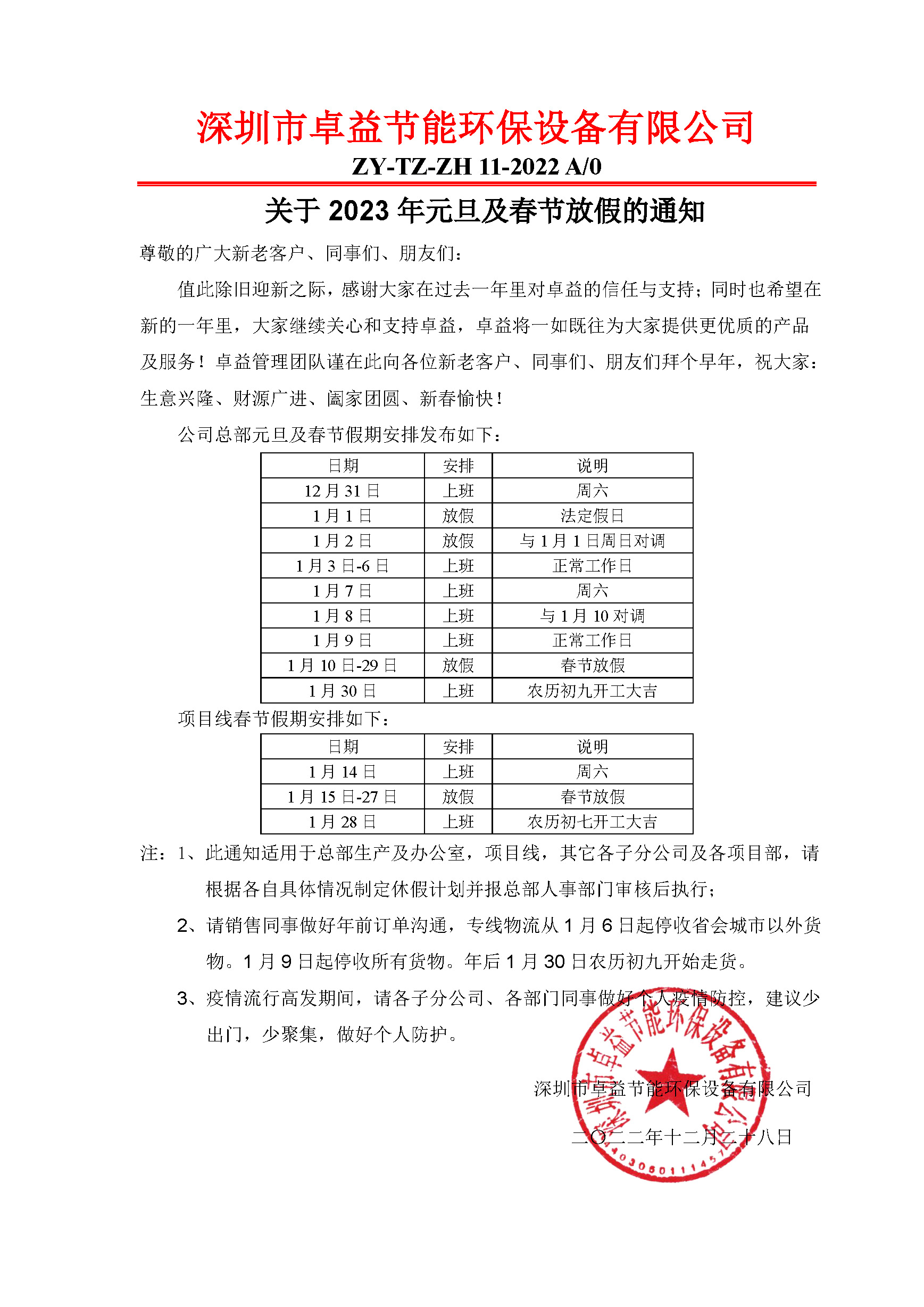關于2023年元旦及春節放假的通知