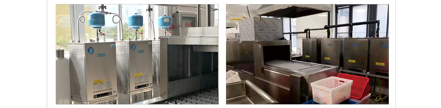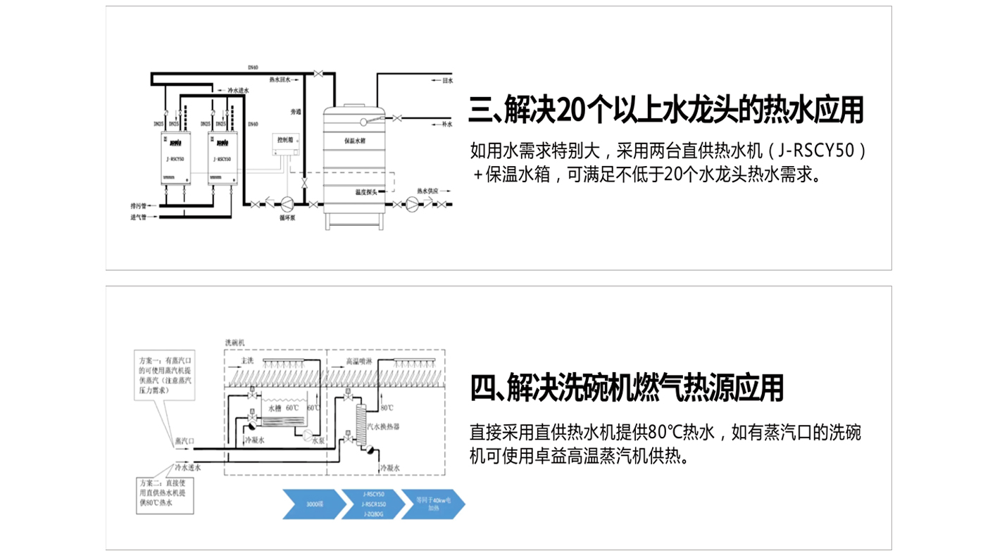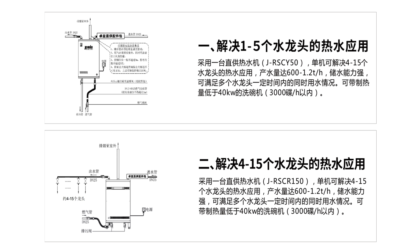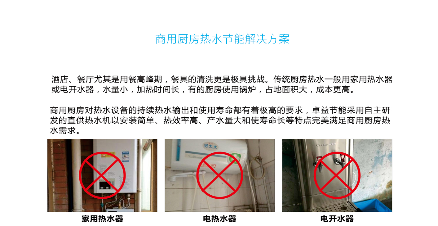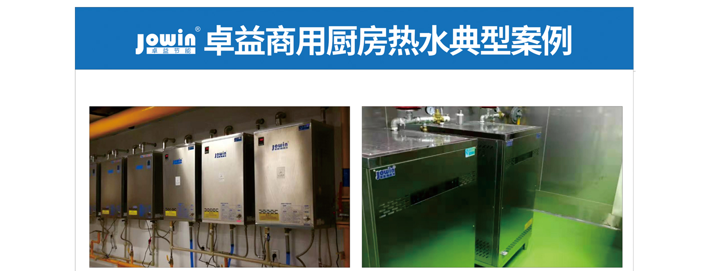酒店、餐廳尤其是用餐高峰期,餐具的清洗更是極具挑戰。傳統廚房熱水一般用家用熱水器 或電開水器,水量小,加熱時間長,有的廚房使用鍋爐,占地面積大,成本更高。 商用廚房對熱水設備的持續熱水輸出和使用壽命都有著極高的要求,卓益節能采用自主研 發的直供熱水機以安裝簡單、熱效率高、產水量大和使壽命長等特點完美滿足商用廚房熱 水需求。